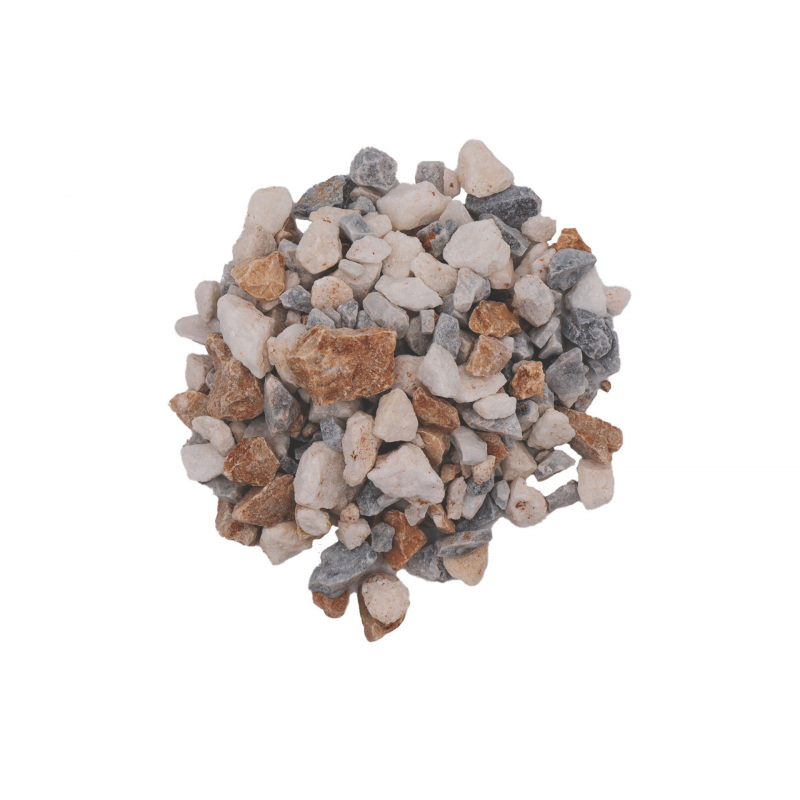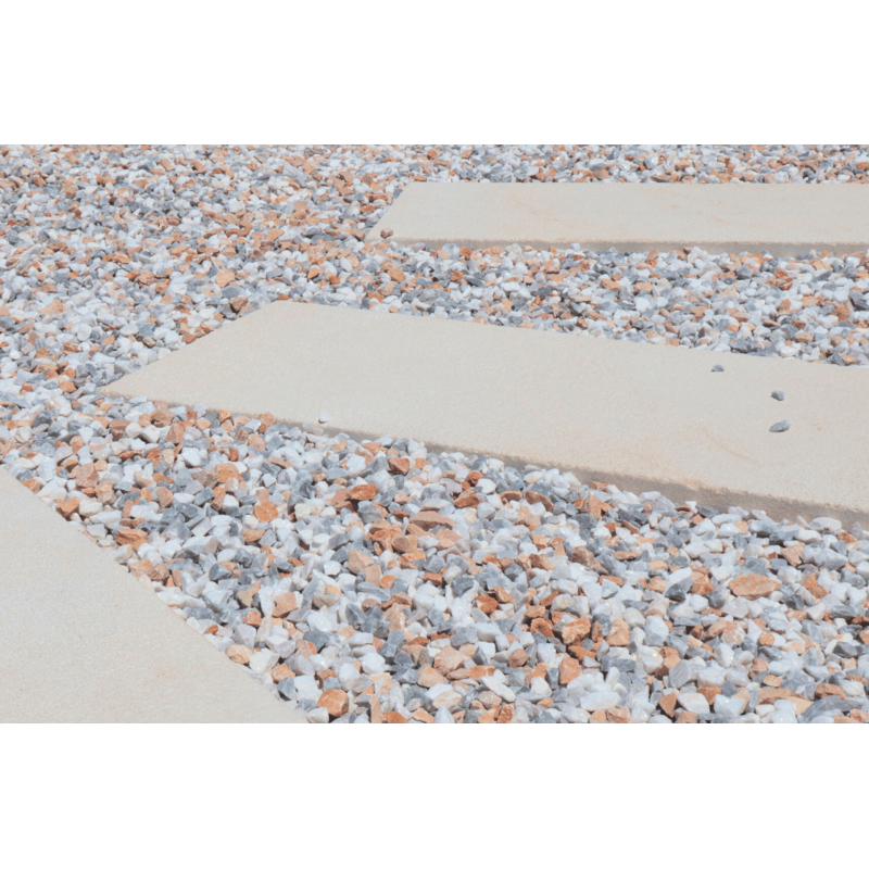 Le gravillon Arlequin est constitué d’un mélange de graviers blanc, gris bleuté et beige.